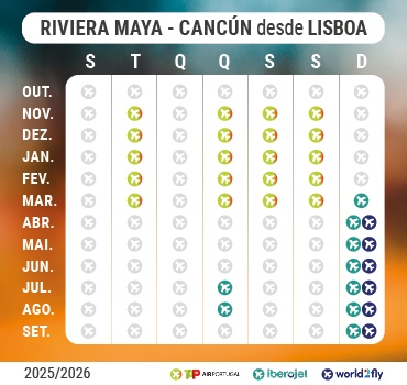Com CentraldeVacaciones.com, pode reservar facilmente o seu pacote com voo direto de Lisboa para Cancún (aeroporto de entrada da Riviera Maya) operado por companhias de renome. Os transfers e alojamento Tudo Incluído estão incluídos, permitindo-lhe desfrutar das suas férias sem preocupações desde o primeiro minuto.